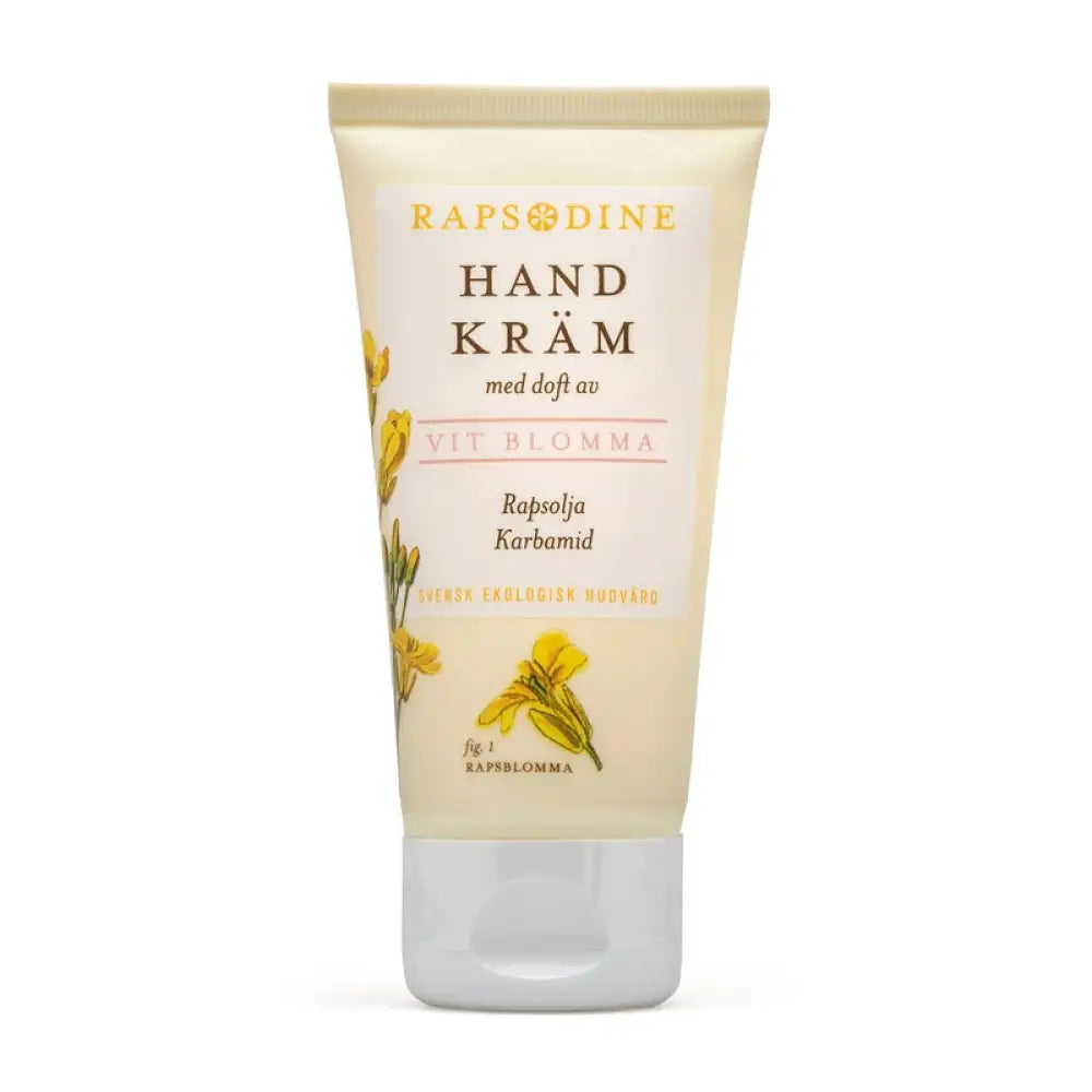 Rapsodine Handkräm Vit Blomma är en vårdande och fuktighetsbevarande handkräm, baserad på svensk ekologisk rapsolja. Formulan absorberas snabbt och ger långvarig återfuktning, samtidigt som den mjukgör och skyddar huden mot yttre påfrestningar.