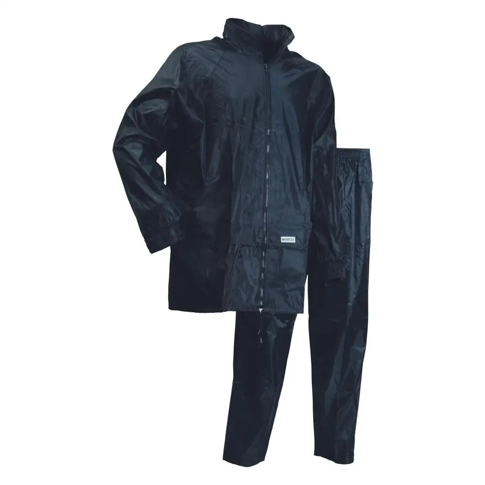 Regnset, jacka och byxa. Jacka: Fast huva i kragen, kardborrejustering vid ärmslut och två utvändiga fickor. Byxa: Dragsko i midjan, två ficköppningar(*). Material: 50% nylon, 50% PVC, 110 g/m². Vattentäthet: 8000 mm. EN 343 (Definierar plaggets vattentäthet och andasförmåga). Levereras i påse.
