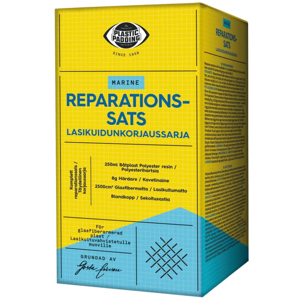 För reparation av hål och sprickor på olika material såsom glasfiberlaminat, stål, aluminium, gjutjärn, trä m.m. Idealisk för plastbåtar, surfingbrädor, snöskotrar och takboxar av ABS, expoxy- eller polyestermaterial. 250 ml båtplast, härdare, glasfibermatta, blandspackel, pensel, blandkopp. Bruksanvisning på kartongen.