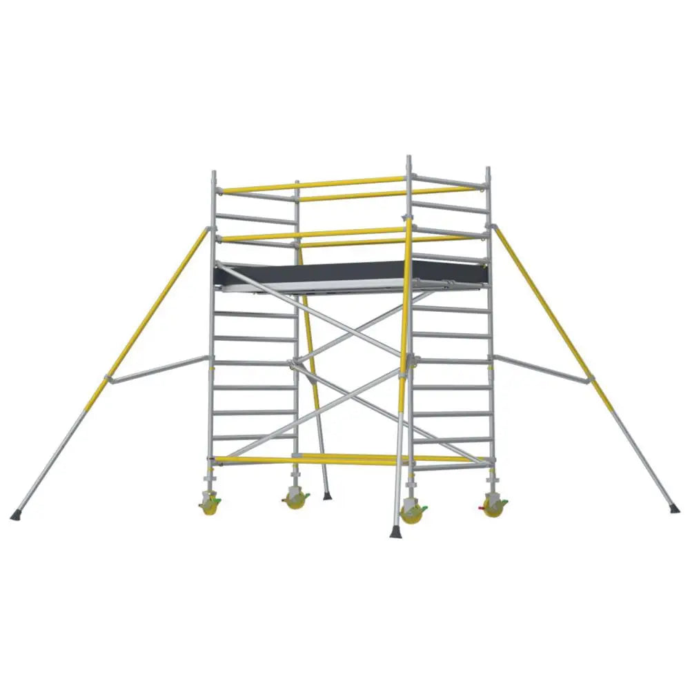 Robust och lättmonterad rullställning (1,4x2,5 m) med överlappande stagning och genomtänkta lösningar för säkrare jobb. Komplett med två plattformar och lutande trappstege varannan meter, två topplattformar, sparklist, justerbara hjul (200 mm) och stödben. Extra säker montering tack vare 1-meters ramar i botten som ger skydd på två sidor vid montering av nästa sektion. Stor arbetsyta (2,4x1,3 m) på översta plattformen och speciallucka för enkel uppstigning till översta planet. Mjukt formade profiler, låsklor med ergonomiskt två-finger-grepp och färgkodade delar för enklare transport, hantering och montering. Kan enkelt byggas på till önskad höjd med påbyggnadspaket.