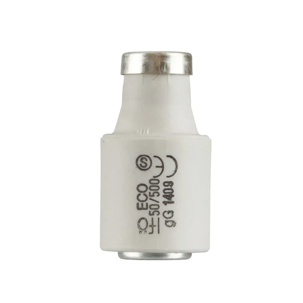 D-säkring Eco gG DII 6A 500V. Miljövänlig D-säkring för ledningsskydd fri från bly och kadmium. Uppfyller IEC 60269, hög brytförmåga, utmärkt selektivitet samt en optimerad smältkarakteristik. Porslinshöljet ger hög termisk chockbeständighet och optimal värmeledningsförmåga. Kontakterna är av koppar eller kopparlegering som ger hög ledningsförmåga och lågt kontaktmotstånd. Kontakterna är förnicklade eller försilvrade för bästa kontakt och lågt övergångsmotstånd. Låg effektförbrukning, vilket innebär låg temperatur på säkringen och kringliggande utrustning samt minskar risken för oxidation. Låg effektförbrukning innebär dessutom lång livslängd, vid märkström är den åldersbeständig. Låg energiförbrukning ger också lägre driftkostnader och minskad förlustenergi i nätet. Levereras i 5-pack.