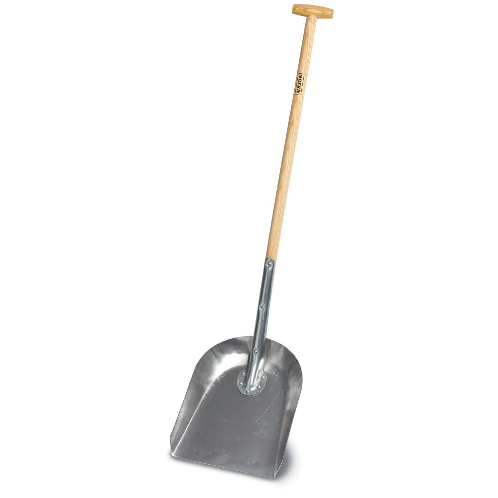 - Aluminiumskyffel med linoljat träskaft i ask med kryckhandtag.