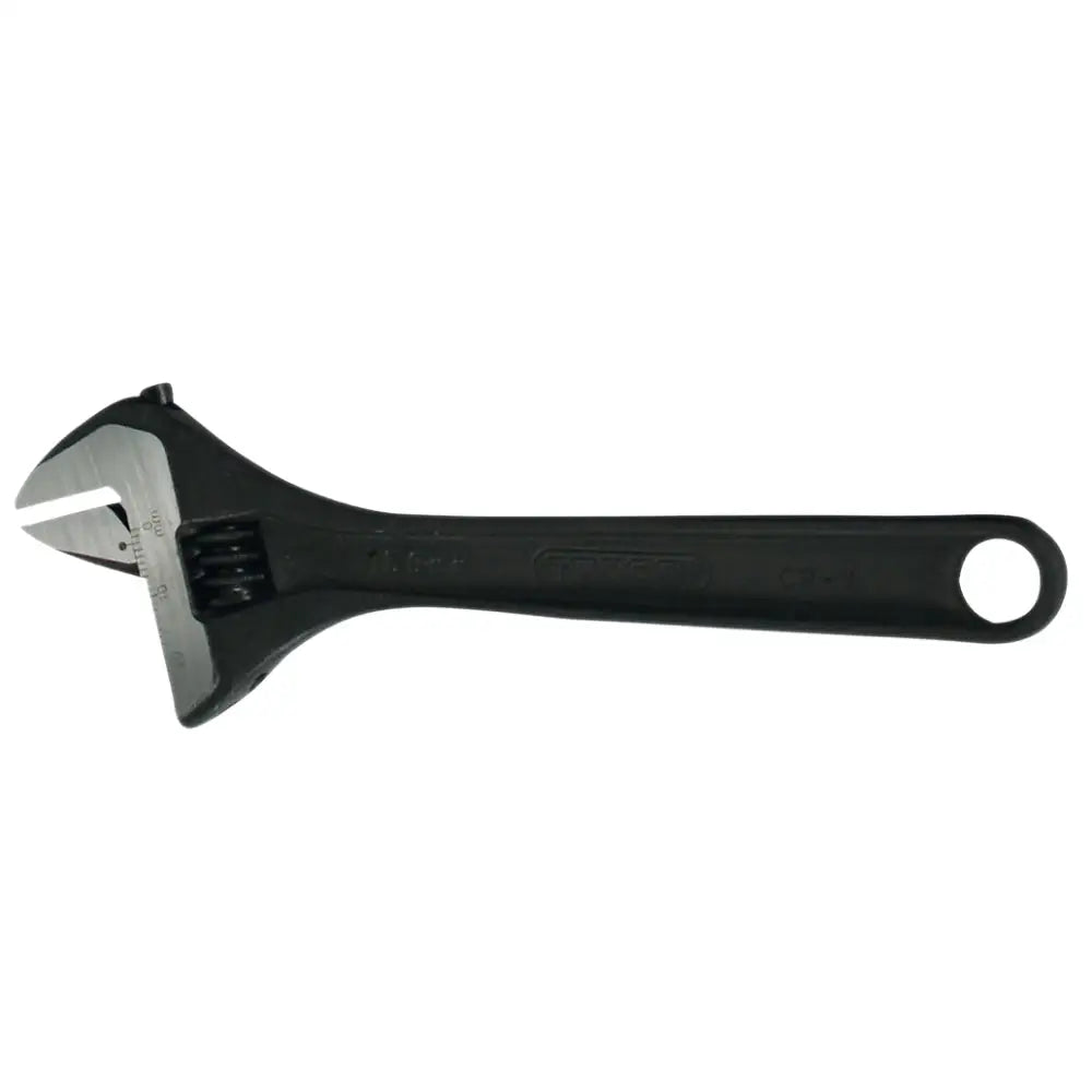 Skiftnyckel, med skala för mutterdim. Tillverkad i Cr-V stål. Svartoxiderad ytfinish. Överenstämmer med DIN 3117/ISO6787.