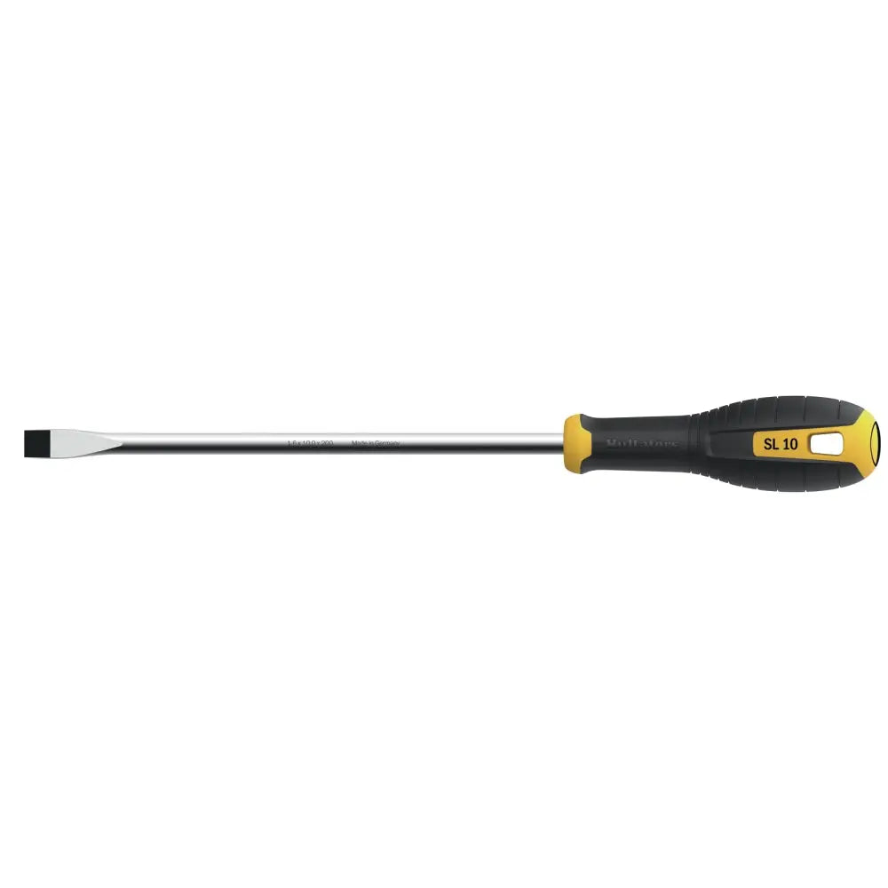 Spårskruvmejsel för professionellt bruk, utvecklad tillsammans med hantverkare. Ergonomisk design för optimal komfort. Det långa gummerade handtaget erbjuder grepp för precision och maximal kraftöverföring. Handtaget är tillverkat i tålig PPC-plast med ett överdrag av åldersbeständigt och greppvänligt gummi. Den permanenta märkningen av typ och storlek på toppen samt handtagets färg gör det enkelt att välja rätt skruvmejsel. Klingan är tillverkad av högkvalitativt härdat stål för lång livslängd. Skruvmejselns handtag har hål för upphängning eller verktygssäkring. Handtagets utformning förhindrar skruvmejseln att rulla på lutande yta.