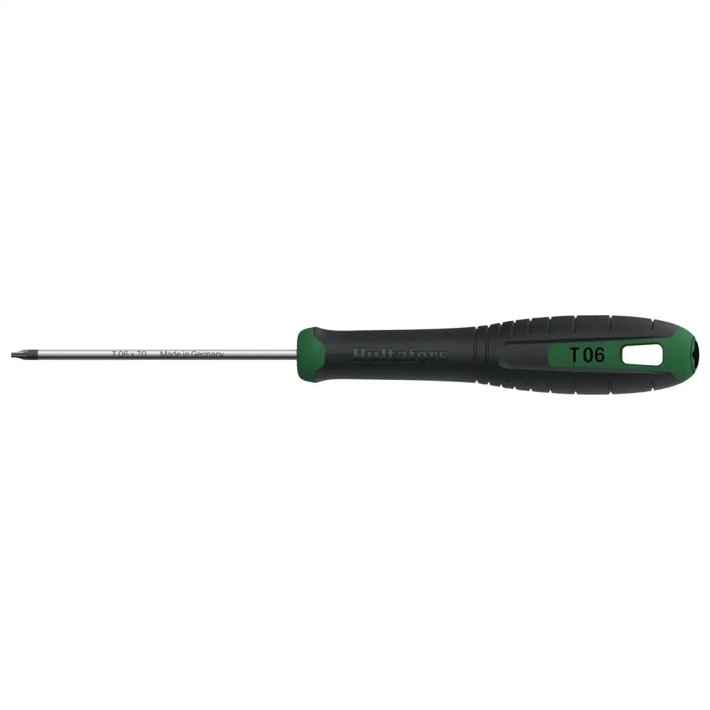 Torxmejsel för professionellt bruk, utvecklad tillsammans med hantverkare. Ergonomisk design för optimal komfort. Det långa gummerade handtaget erbjuder grepp för precision och maximal kraftöverföring. Handtaget är tillverkat i tålig PPC-plast med ett överdrag av åldersbeständigt och greppvänligt gummi. Den permanenta märkningen av typ och storlek på toppen samt handtagets färg gör det enkelt att välja rätt skruvmejsel. Klingan är tillverkad av högkvalitativt härdat stål för lång livslängd. Skruvmejselns handtag har hål för upphängning eller verktygssäkring. Handtagets utformning förhindrar skruvmejseln att rulla på lutande yta.