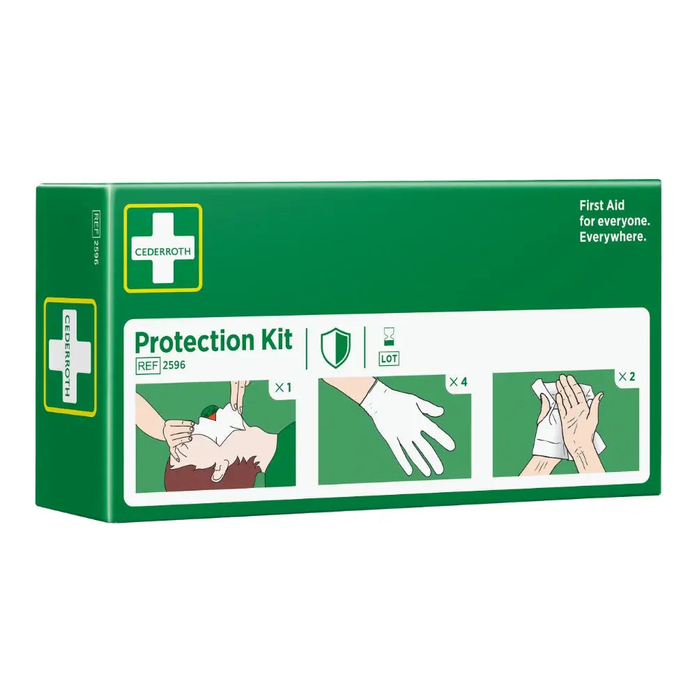 Cederroth Skyddspaket innehåller andningsmask, handskar och sårtvättare. Andningsmasken är ett hjälpmedel för att ge mun-till-mun-andning på rätt sätt samtidigt som det minskar risken för kontakt mellan hjälpare och skadad. Cederroths andningsmask är försedd med backventil. På skyddsduken finns tydliga instruktioner i färg.