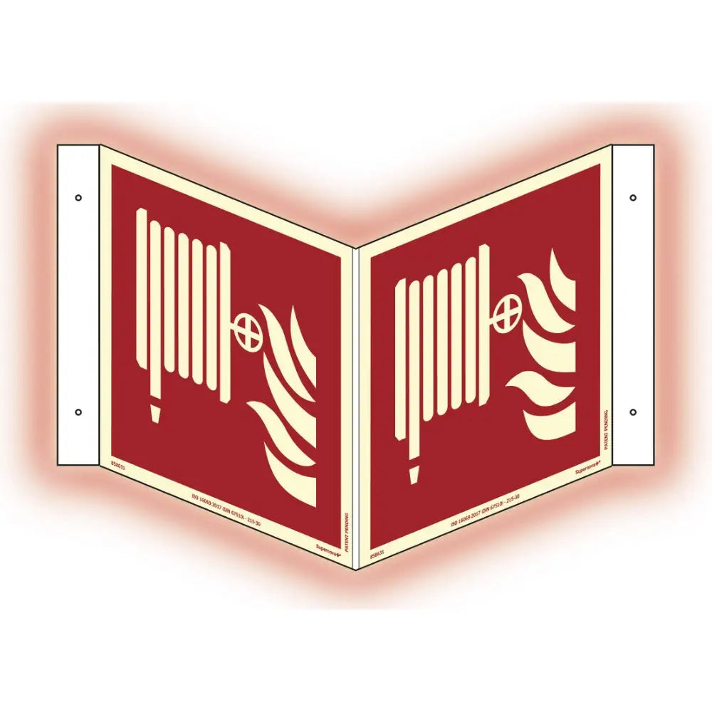 Skylt brandpost plogskylt. Material: Aluminium. Yta: Supernova+. Färgefterlysande skylt med ultrastark lyskraft i mörker. Godkänd enligt ISO 3864, ISO 7010 samt överskrider ISO 16069 vad gäller luminans.