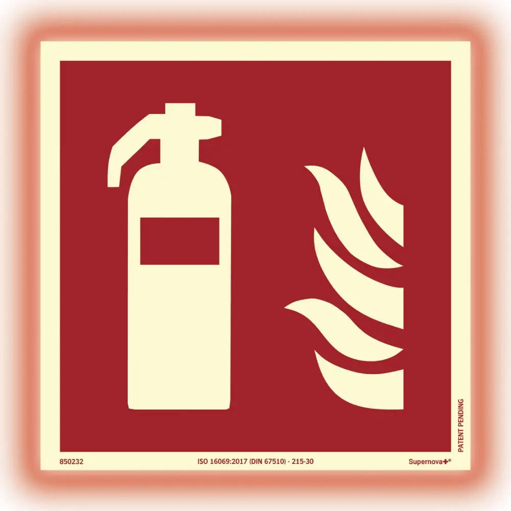 Skylt brandsläckare. Material: Aluminium. Yta: Supernova+. Färgefterlysande skylt med ultrastark lyskraft i mörker. Godkänd enligt ISO 3864, ISO 7010 samt överskrider ISO 16069 vad gäller luminans.
