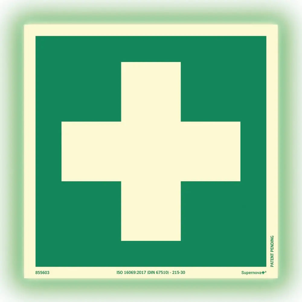 Skylt Första Hjälpen. Material: Aluminium. Yta: Supernova+. Färgefterlysande skylt med ultrastark lyskraft i mörker. Godkänd enligt ISO 3864, ISO 7010 samt överskrider ISO 16069 vad gäller luminans.