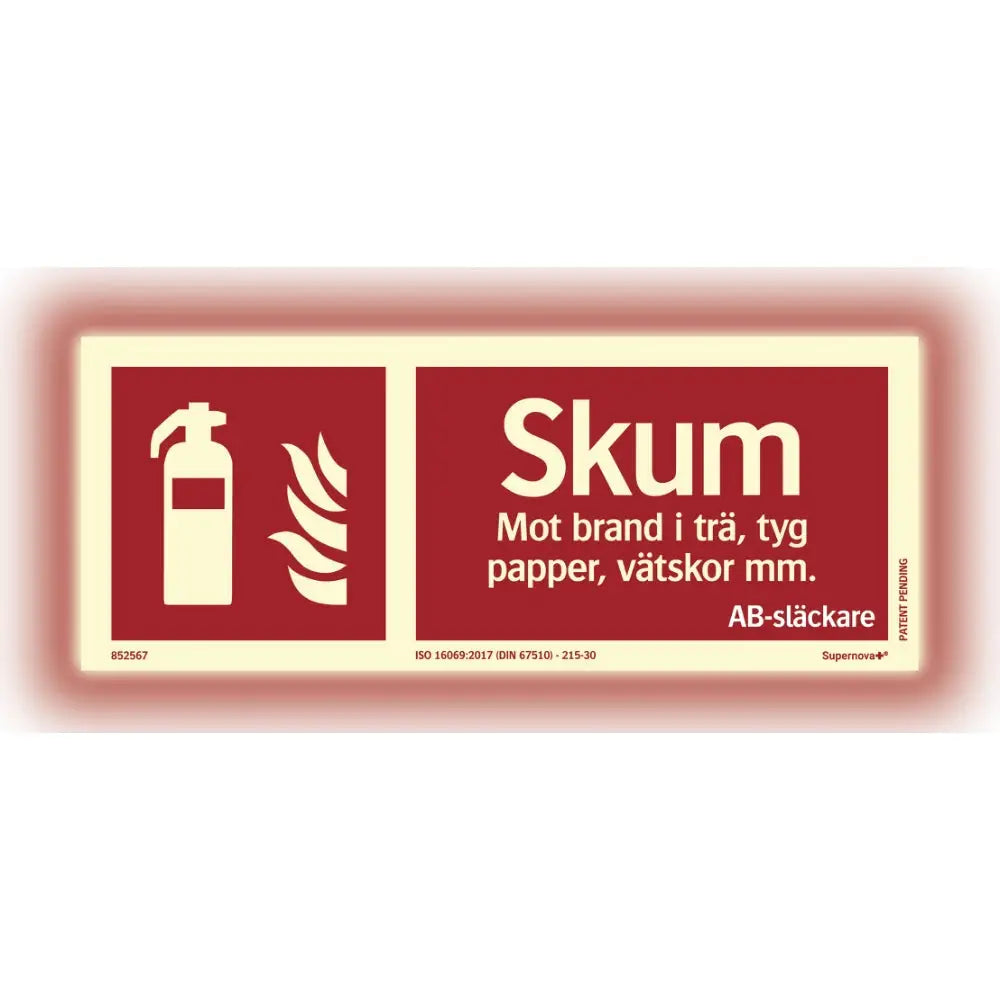 Skylt skumsläckare. Material: Aluminium. Yta: Supernova+. Färgefterlysande skylt med ultrastark lyskraft i mörker. Godkänd enligt ISO 3864, ISO 7010 samt överskrider ISO 16069 vad gäller luminans.