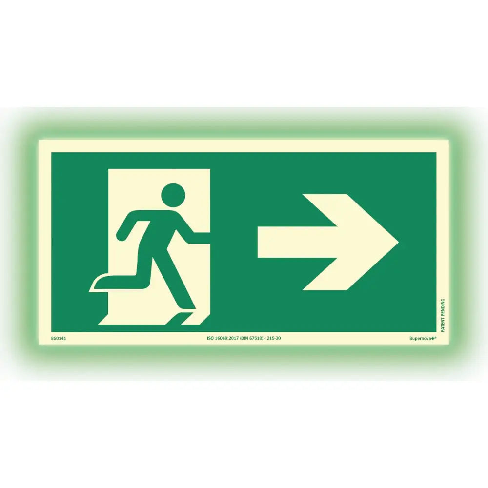 Skylt utrymning pil höger. Material: Aluminium. Yta: Supernova+. Färgefterlysande skylt med ultrastark lyskraft i mörker. Godkänd enligt ISO 3864, ISO 7010 samt överskrider ISO 16069 vad gäller luminans.
