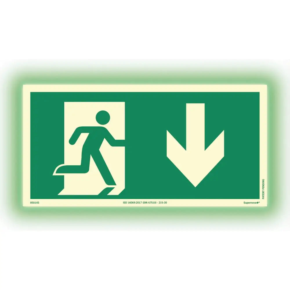 Skylt Utrymningsväg pil ner. Material: Aluminium. Yta: Supernova+. Färgefterlysande skylt med ultrastark lyskraft i mörker. Godkänd enligt ISO 3864, ISO 7010 samt överskrider ISO 16069 vad gäller luminans.