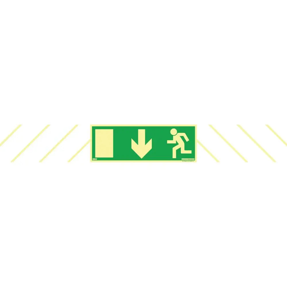 Skylt utrymning pil ner. Midjeskylt till dörr. Material: Aluminium. Yta: Supernova. Skylten efterlyser i mörker med hela sitt budskap.