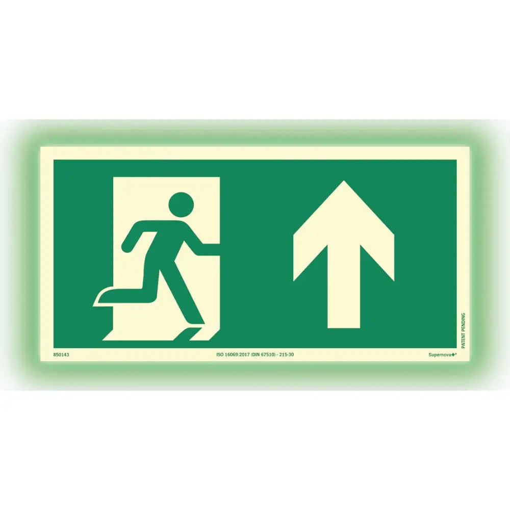 Skylt utrymning pil rakt fram. Material: Aluminium. Yta: Supernova+. Färgefterlysande skylt med ultrastark lyskraft i mörker. Godkänd enligt ISO 3864, ISO 7010 samt överskrider ISO 16069 vad gäller luminans.