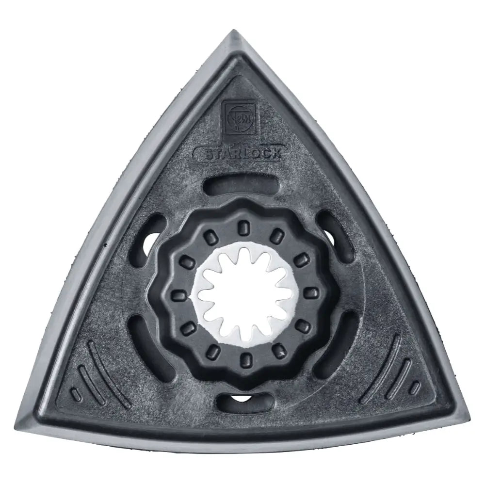 Standardutförande för slipning med dammutsug. Fästplatta av plast för att undvika skador och märken på arbetsstycket. Trekantig, hålat utförande, kardborrplatta. Kantlängd: 80 mm. Fäste: Starlock.