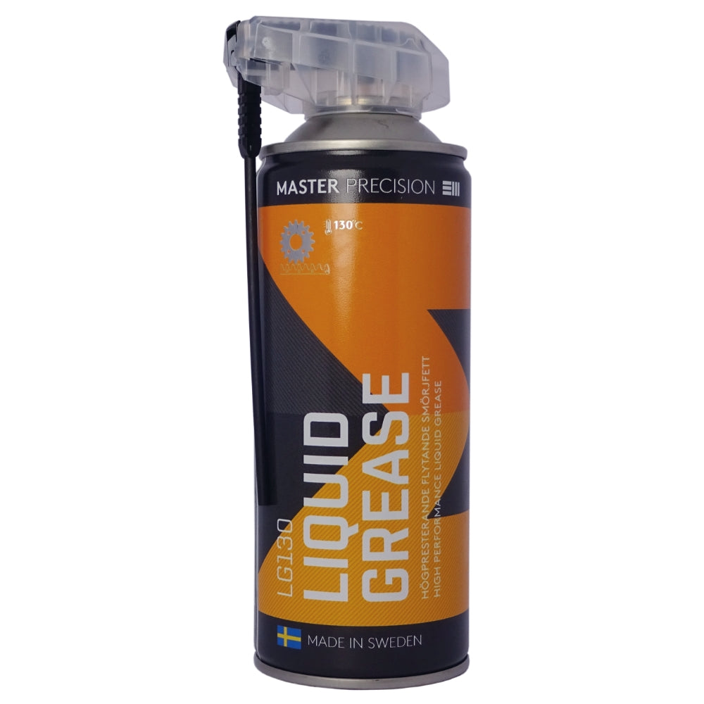 MASTER LG 130/LIQUID GREASE är ett mycket beständigt, icke förtvålat fett. LG 130 innehåller högmolekylära polymerer som tillhandahåller en fantastisk fästförmåga på metaller, tål hög belastning samt säkerställer en långsiktig smörjning även på utsatta delar. Produkten skyddar även mot korrosion. LG130 är lämplig för smörjning av kedjor, konveyers, kraftöverföringar, vires, gångjärn och var helst man önskar en varaktig smörjfilm. Utmärkt för smörjning av kuggstänger och rekommenderas för användning i verkstad, industri, marina miljöer etc.
