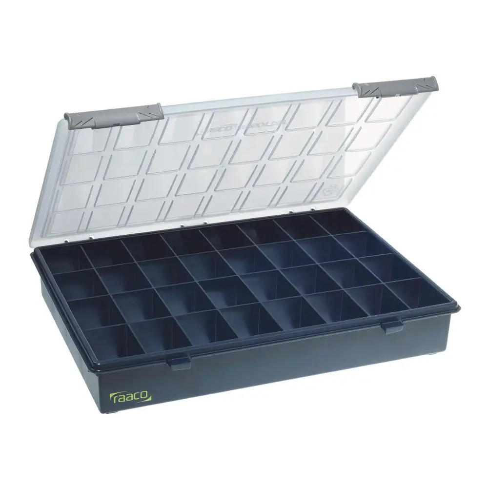 Sortimentsask med 32 fasta fack. Försedd med skjutlås. Tillverkad av polypropylen (PP). Färg: Mörkblå.