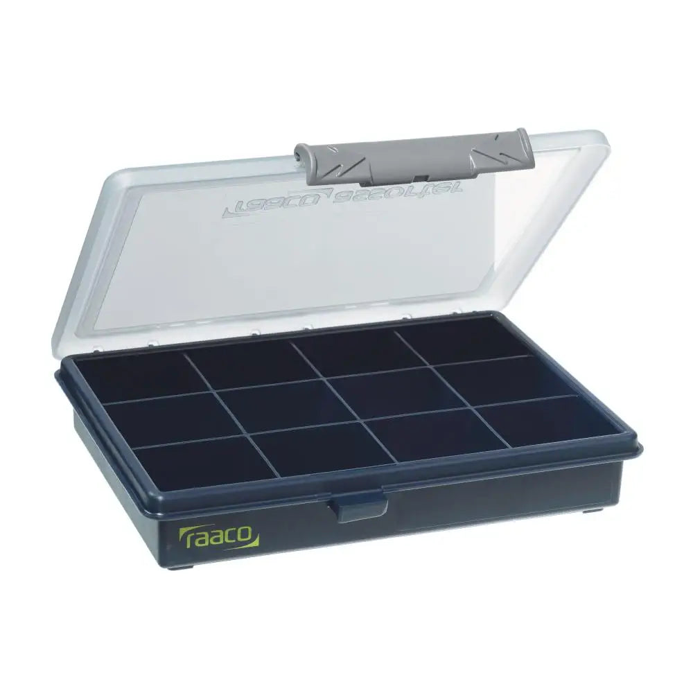Sortimentsask med 12 fasta fack. Försedd med skjutlås. Tillverkad av polypropylen (PP). Färg: Mörkblå.