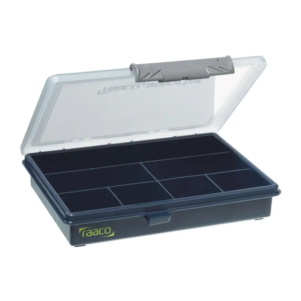 Sortimentsask med 7 fasta fack. Försedd med skjutlås. Tillverkad av polypropylen (PP). Färg: Mörkblå.