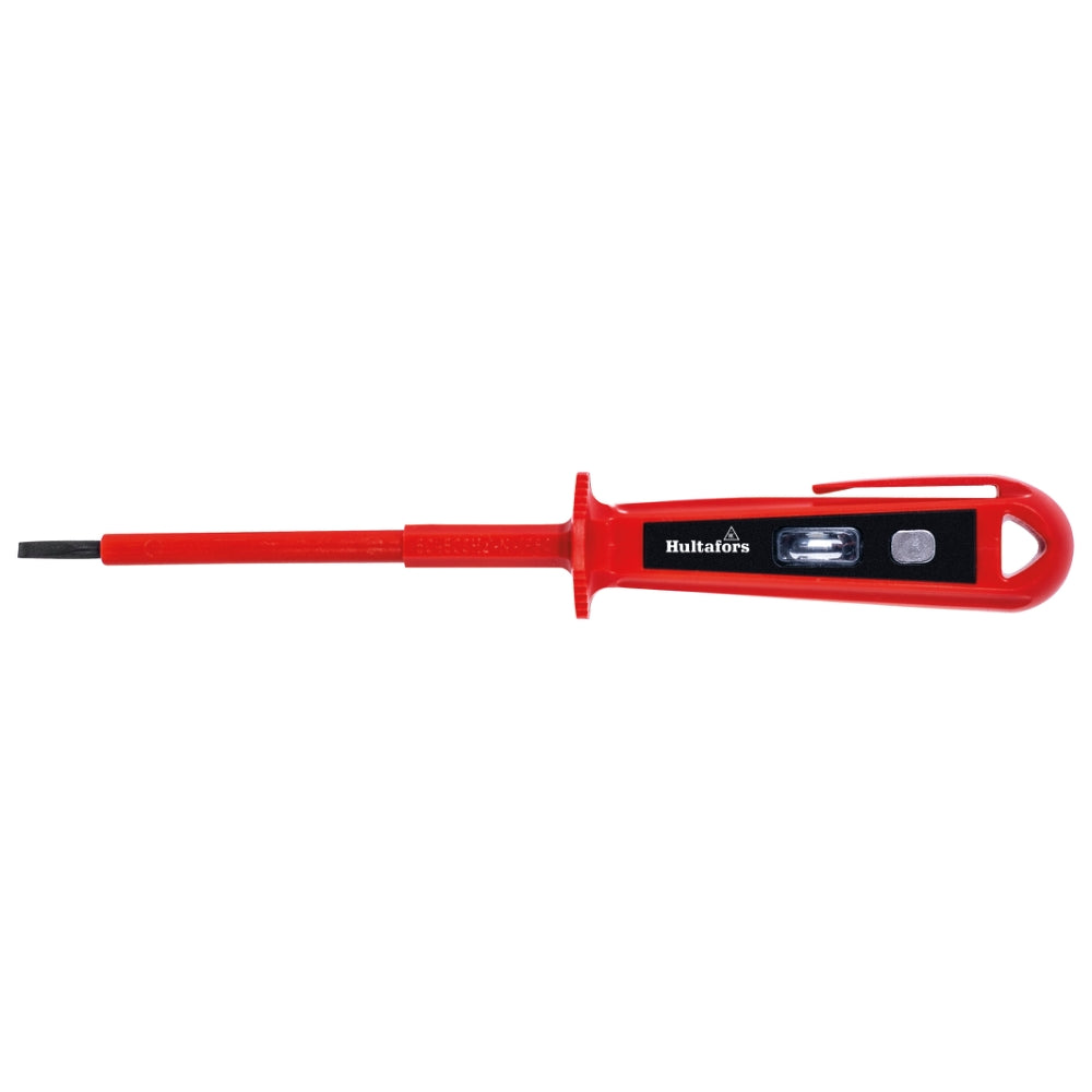 Skruvmejsel med spänningsprovare för 125-250 V. Isolerat handtag och inbyggd diod.