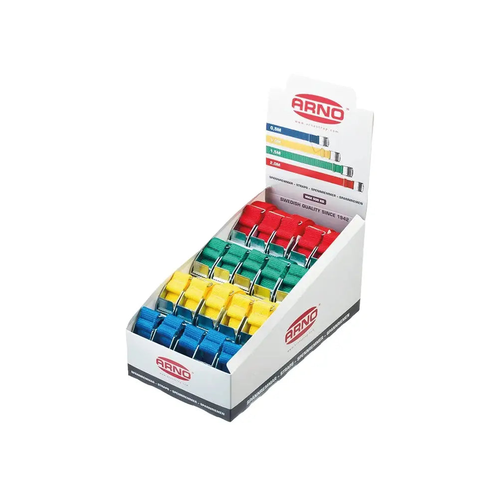 Arno spännremsdisplay innehållande 40 st 25 mm breda remmar i 4 längder och 10 st av varje: 0,5 m blå, 1,0 m gul, 1,5 m grön, 2,0 m röd. Samtliga med hälla och kraftigt kamlåsspänne av metall. Tillverkad av väderbeständigt slitstarkt och styvt polyesterband med tät väv som är mycket tåligt mot slitage, olja och värme. För snabb, säker och enkel surrning av mindre gods på takräcken, pallar och flak.
