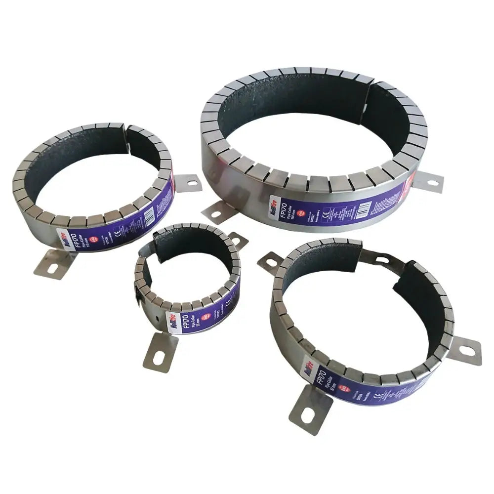 FP170 svällande rörkragar säkerställer brandmotståndet i golv och väggar vid genomföringar med brännbara rör. Vid en eventuell brand expanderar fyllnadsmaterialet till flera gånger sin ursprungliga tjocklek och sluter tätt när plaströren smälter och brinner av. Vid öppningen bildas en förkolning som sluter helt tätt. FP170 kan även användas runt stålrör med cellgummiisolering. Kontakta teknisk service för mer information.