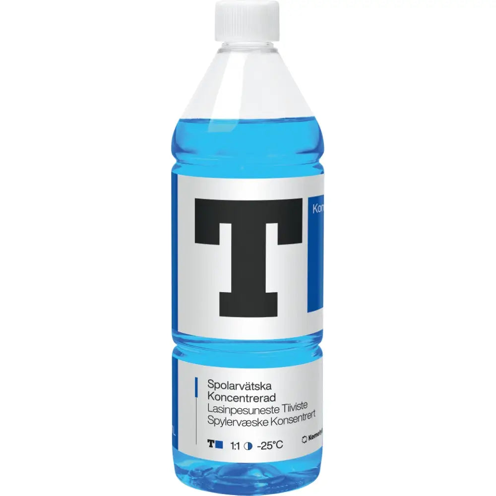 Frostskydds- och rengöringsmedel för bilens rutor, strålkastare, fönster och speglar. T-Blå tar effektivt bort vägsalt, trafikfilm, olja och annan smuts. T-Blå skadar inte bilens gummilister, torkarblad eller lack under förutsättning att den blandas enligt rekommendation. Blandningsförhållande koncentrerad spolarvätska: 1:1 ger frysskydd till -25°C*, 1:2 ger frysskydd till -13°C*, 1:4 ger frysskydd till -6°C*, *frysskyddet anger när första iskristallen bildas enligt mätmetod ASTM D1177.