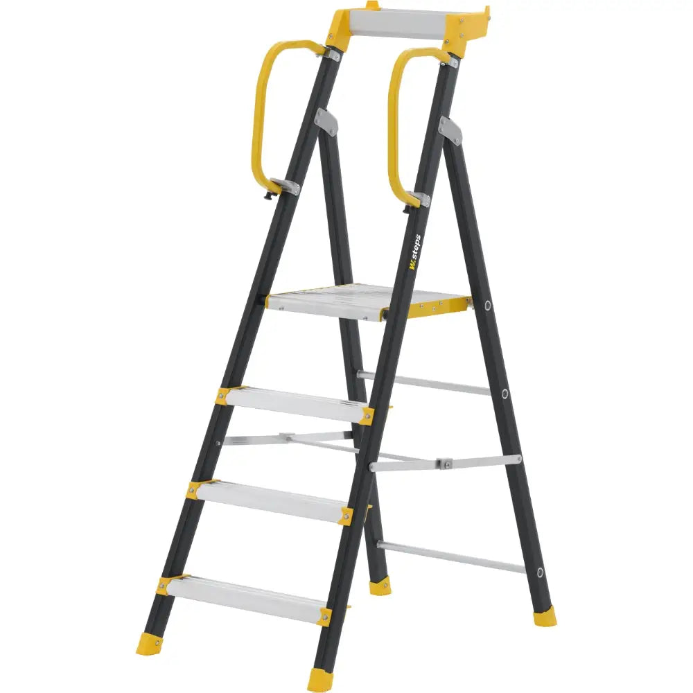 En robust, stabil och hållbar trappstege för daglig professionell användning. Extra stor metallplattform (400 x 400 mm) med grovt dubbelriktat halkskydd ger dig gott om rörelseutrymme för ergonomiskt och effektivt arbete. Räcken ger en säker arbetsplats med rejält fallskydd på 3 sidor - fällbart för att underlätta vid transport.