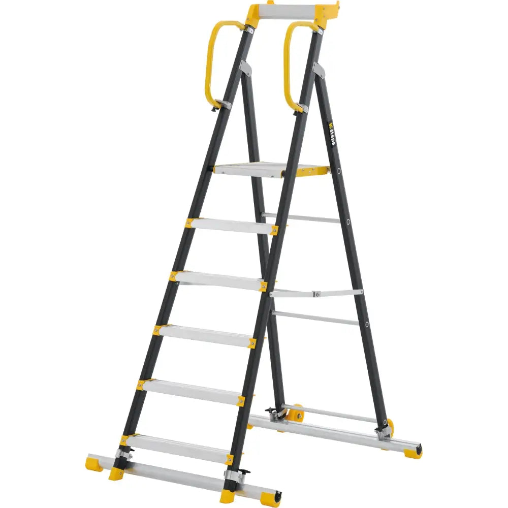 Den stora metallhyllan har stor plats för verktyg och material så att du kan arbeta med händerna fria. Sammankopplade aluminiumlänkar så att du kan låsa båda med bara ett handgrepp. Innovativ infästningsteknik med FDS-skruv ger en stabil konstruktion med minimal svikt och riktigt lång livslängd. För att underlätta transport så finns hjul monterade på stödsidan på 6- och 8-stegsmodeller.