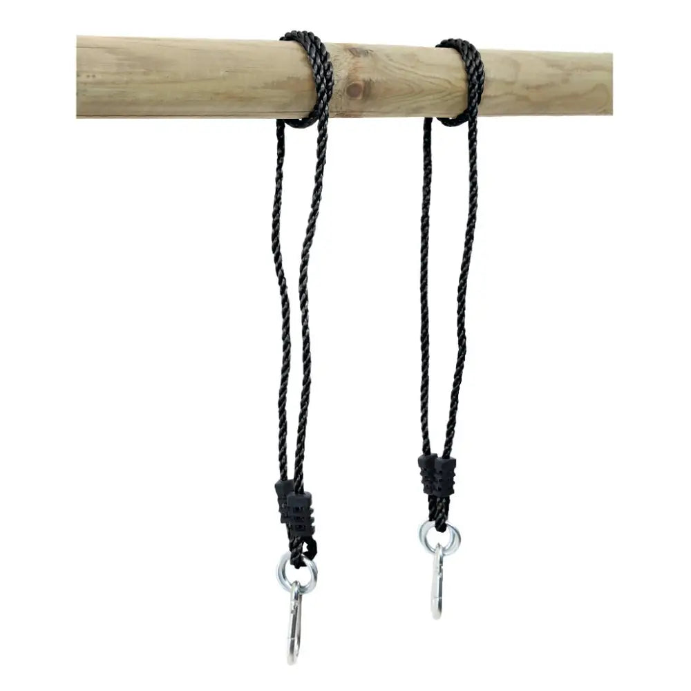 1,5 m långa upphängningsrep (2 st) med rejäla metallringar i repändorna, fästs samman med en karbinhake. Viras runt t.ex. en stabil trädgren. Max last 50 kg.