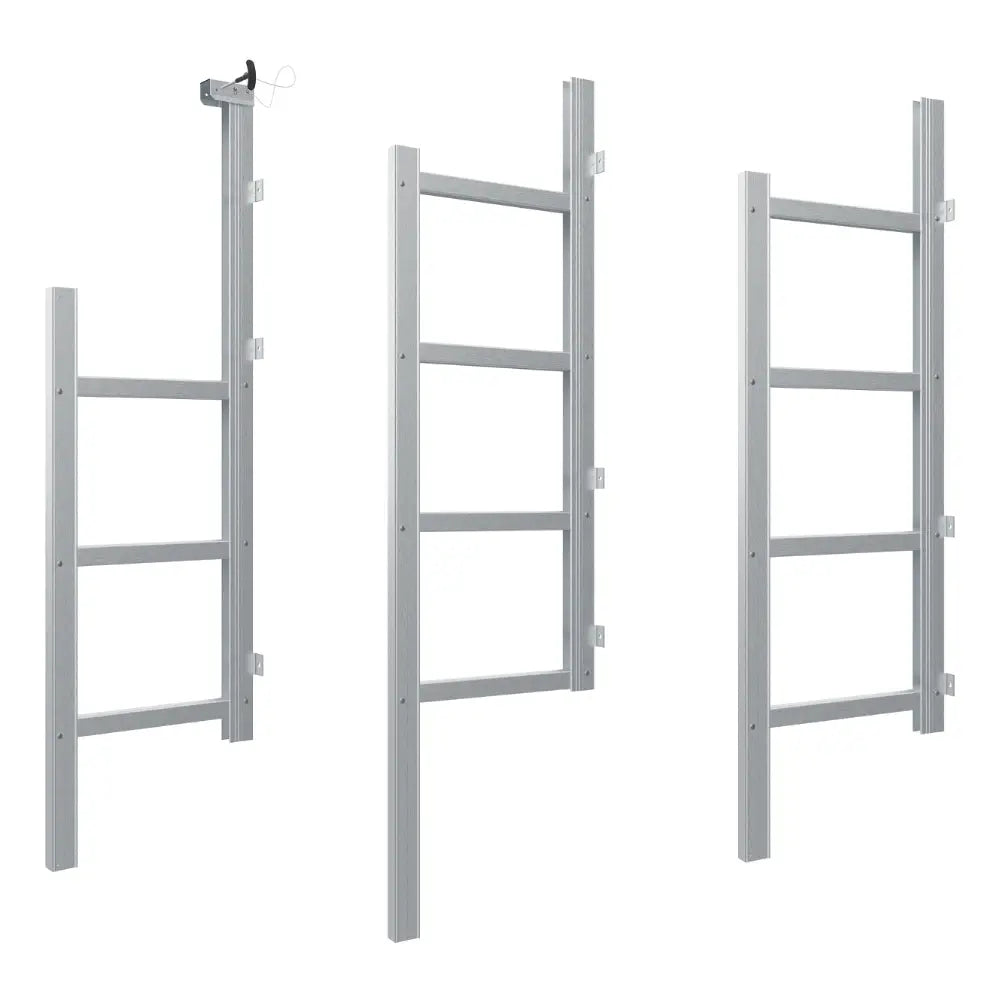 Väggfästen och skarvar ingår i alla paket och en vajerförsedd sprint ingår i baspaketet. Bultar för infästning i vägg ingår ej eftersom väggkonstruktioner varierar på olika hus. Kontakta din fackhandel för att få rätt infästning för ditt hus. Du behöver 2 st bultar för varje väggfäste, det krävs 18 st bultar för stegarna i baspaketet och ytterligare 6 st bultar för varje mellanstege.