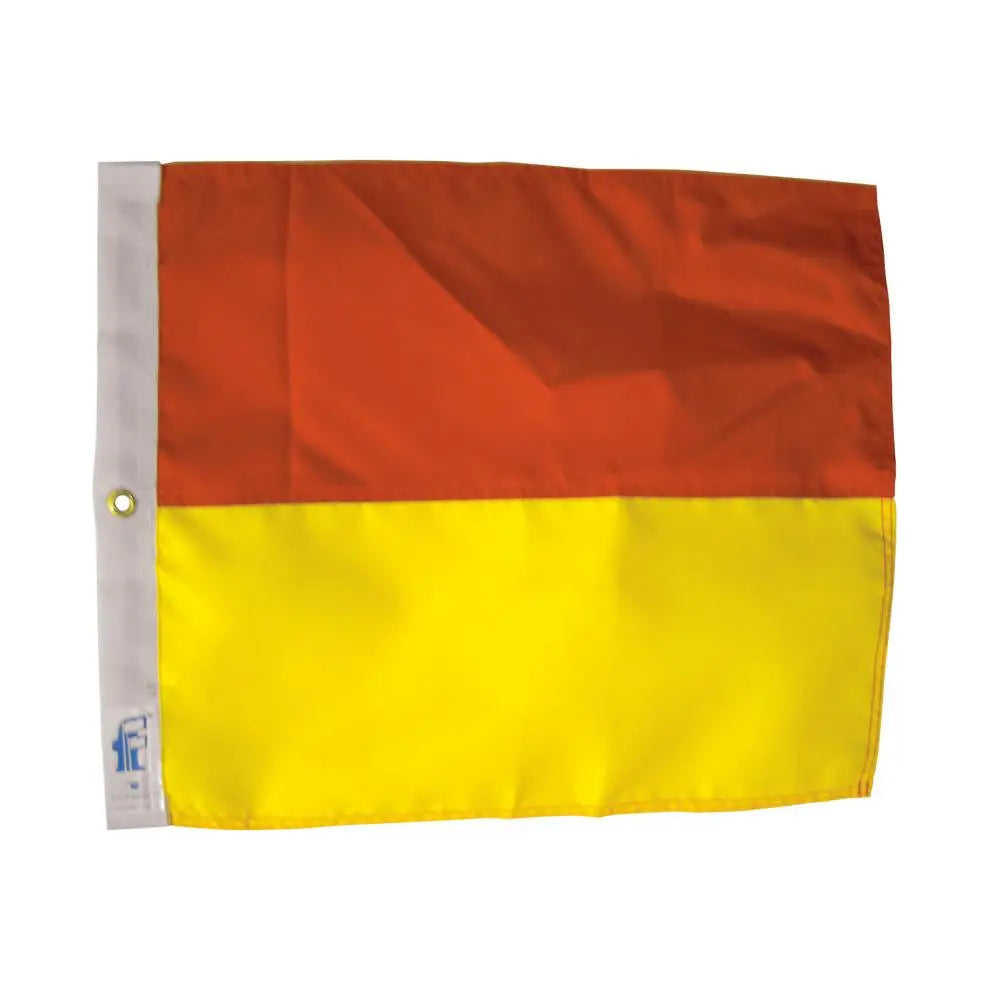 Varningsflagga i gult och rött. Sydd i 160gr marinpolyester med kantband och öljett. (Förpackad i påse med ryttare).