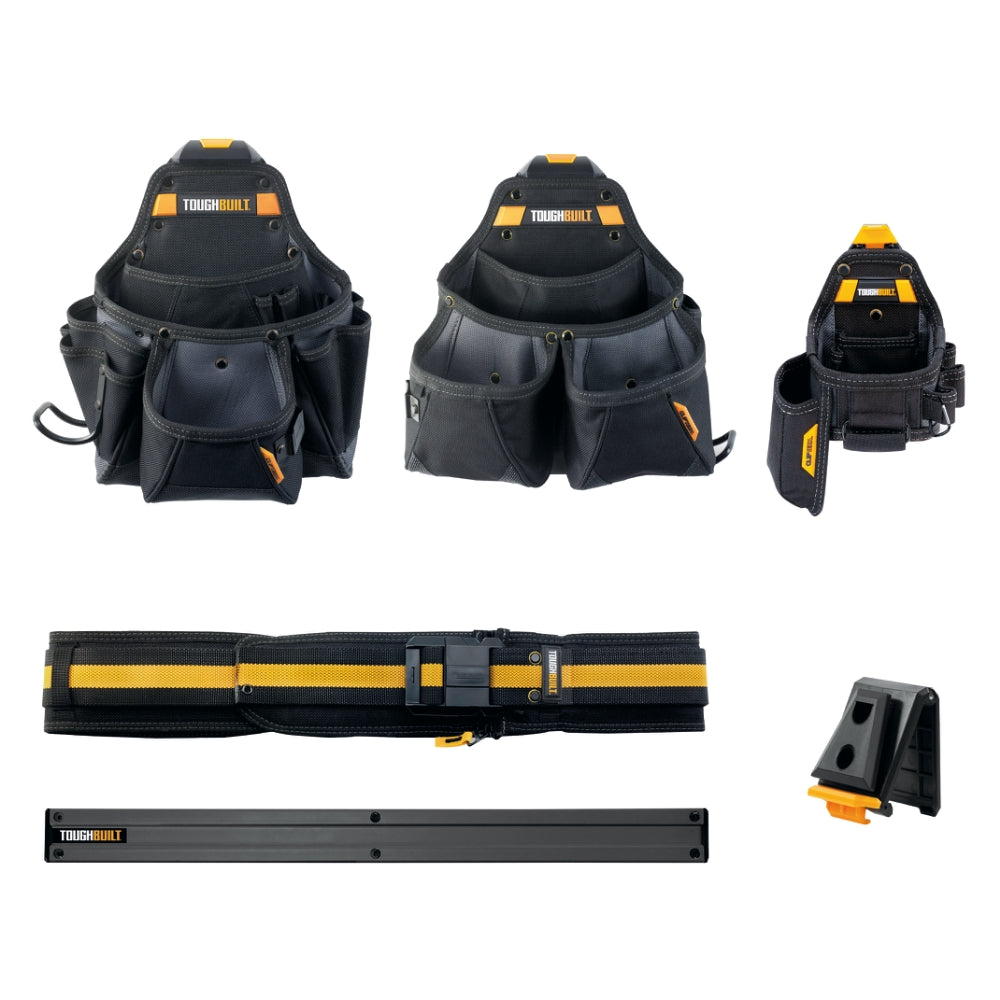 ToughBuilt 11-delars verktygsbältesset med 60 cm ClipTech list och 6 st ClipTech hållare för optimal förvaring av dina Toughbuilt ClipTech väskor i bilen, på arbetsplatsen, på liften, stegen m.m. Det patenterade ClipTech fästet ger dig full frihet att klicka av eller på dina verktygsfickor som du vill och kunna anpassa dem efter varje jobb du har. Det vadderade bredare ventilerade bältet med snabbspänne och kardborre ger ett gott stöd med minimal belastning.