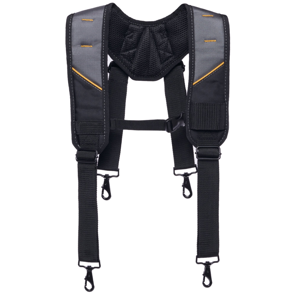 ToughBuilt vadderat och ventilerat verktygsbälteshängsle Pro för optimal komfort med avlastning under hela arbetsdagen. Fördelar effektivt vikten även vid hög belastning. Universalt kompatibel med alla bälten på marknaden med de fyra karbinhakarna i metall men framtagen främst för alla ToughBuilt bälten.