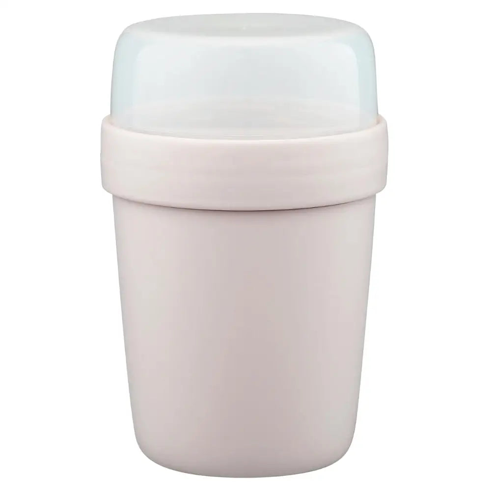 En bägare perfekt att ta med till skolan, jobbet eller gymmet för att kunna ta det lilla målet som mättar och fyller på energin. Bägaren har två fack, muggen och locket. De är täta tack vare den gängade mellandelen som sammanför lock och mugg.